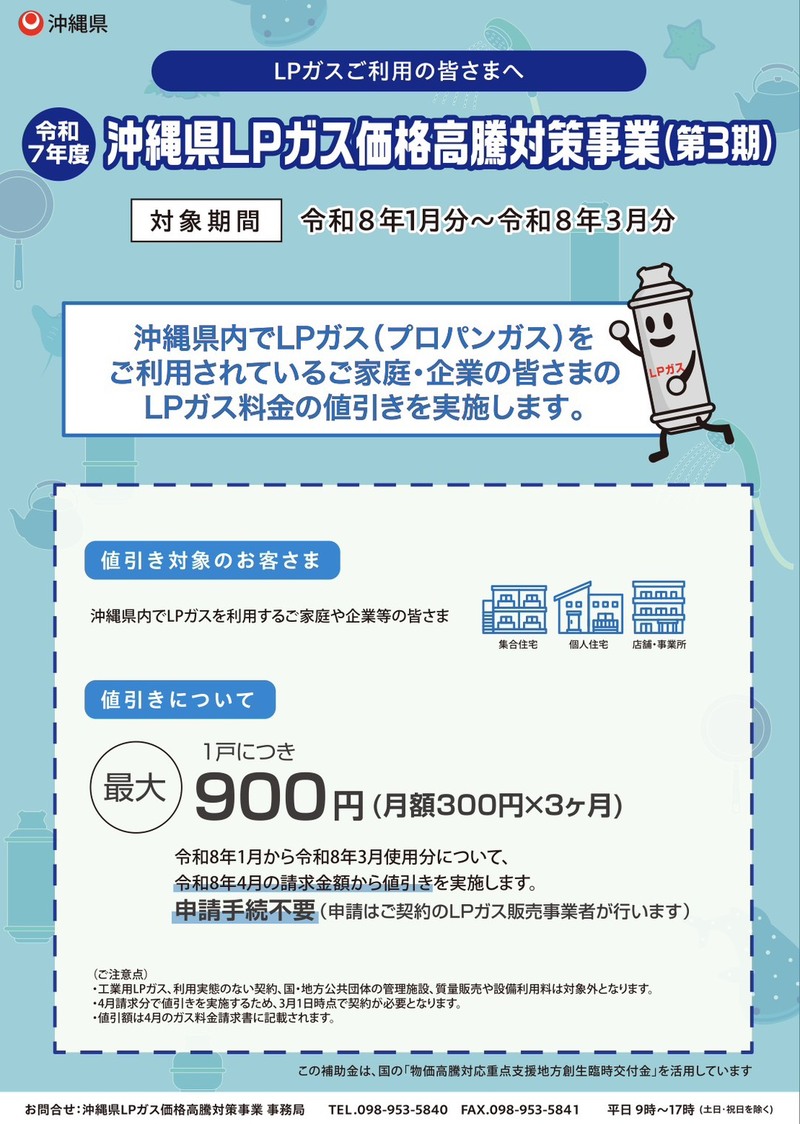 沖縄県の支援によるLPガス(プロパンガス)料金値引きのお知らせ